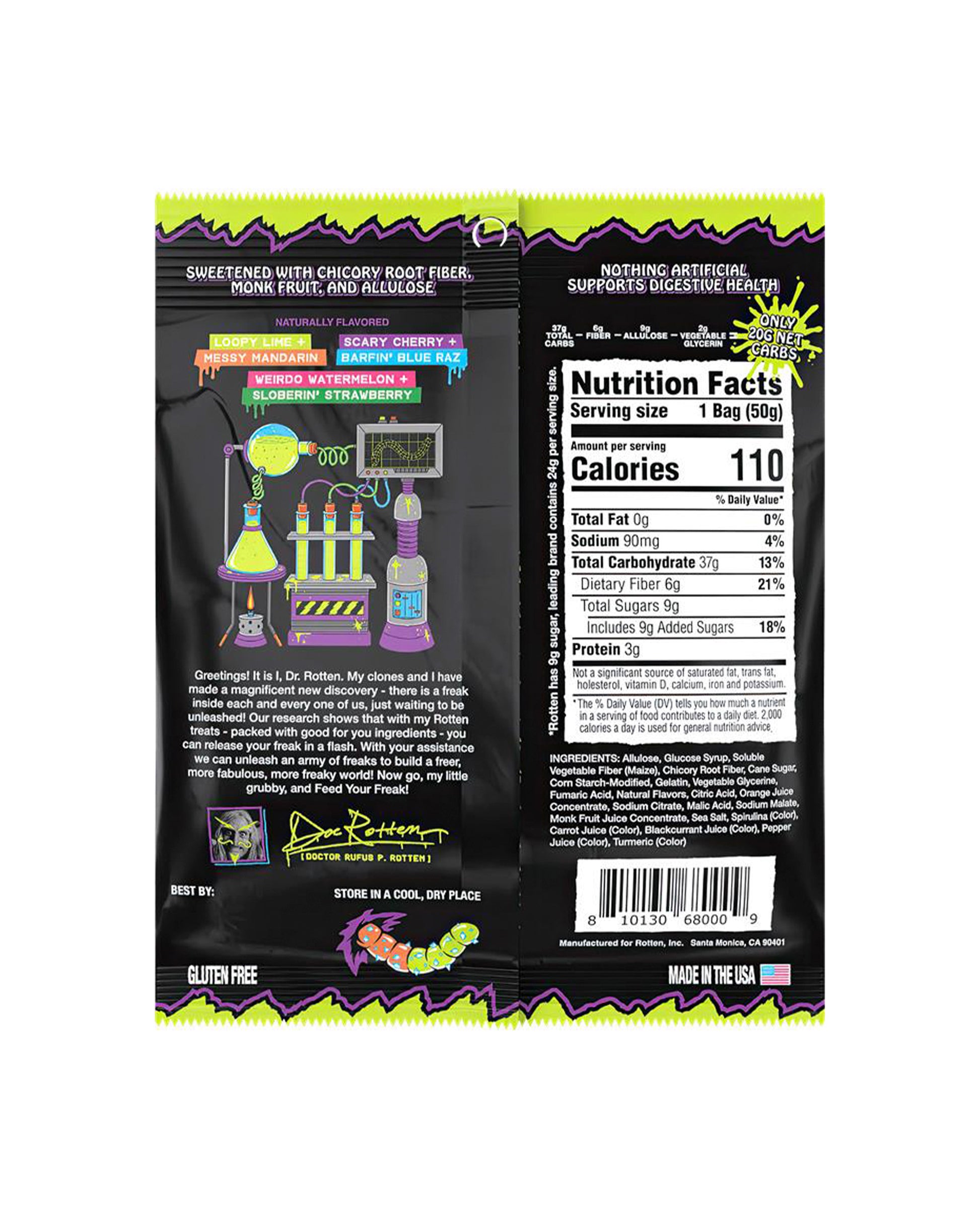 Unwrap more than just candy with Rotten® Sour Gummy Worms! Each bag of these sour, fruity gummies is packed with 6 grams of prebiotic fiber, less sugar than traditional sweets, and colors derived from all-natural fruits, vegetables and superfoods for a healthy, gut-friendly and delicious alternative. These gummies are the perfect afternoon pick-me-up, office desk treat, or gift for a health-conscious sour candy lover!