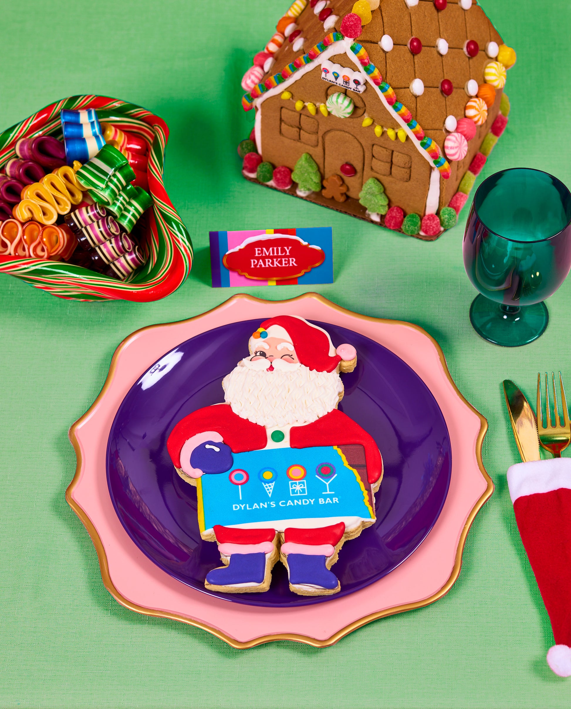 Have a holly and jolly Christmas with this oversized Santa Sugar Cookie, exclusively designed by our Founder and CEO Dylan Lauren! This 10-inch-tall Saint Nick treat is wrapped in clear cellophane and adorned with a purple bow, making it a great gift, stocking stuffer or addition to holiday gift baskets.