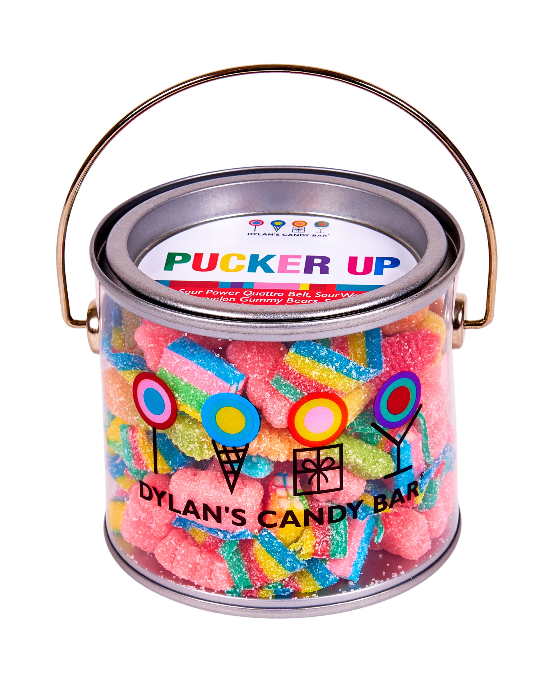 The Pucker Up Paint Can is filled with Sour Fruity Rainbow Belts, Sour Watermelon Gummy Bears, Sour Fruity Neon Gummy Worms, and Sour Strawberry Neon Rainbow Bricks. They are great gifts, party favors and reusable containers. Be sure to keep the attached washer so you can pop open the lid for every sweet (and sour) craving!