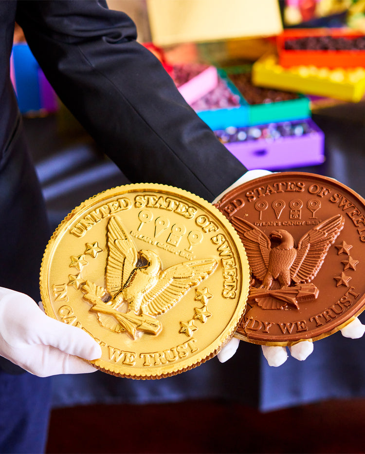 Those fortunate enough to receive this currency will surely prosper and become mega rich in happiness! The stunning, 8-inch solid milk chocolate coin comes elegantly stamped with our Dylan’s Candy Bar® logo, the American Eagle and “United States of Sweet.”
