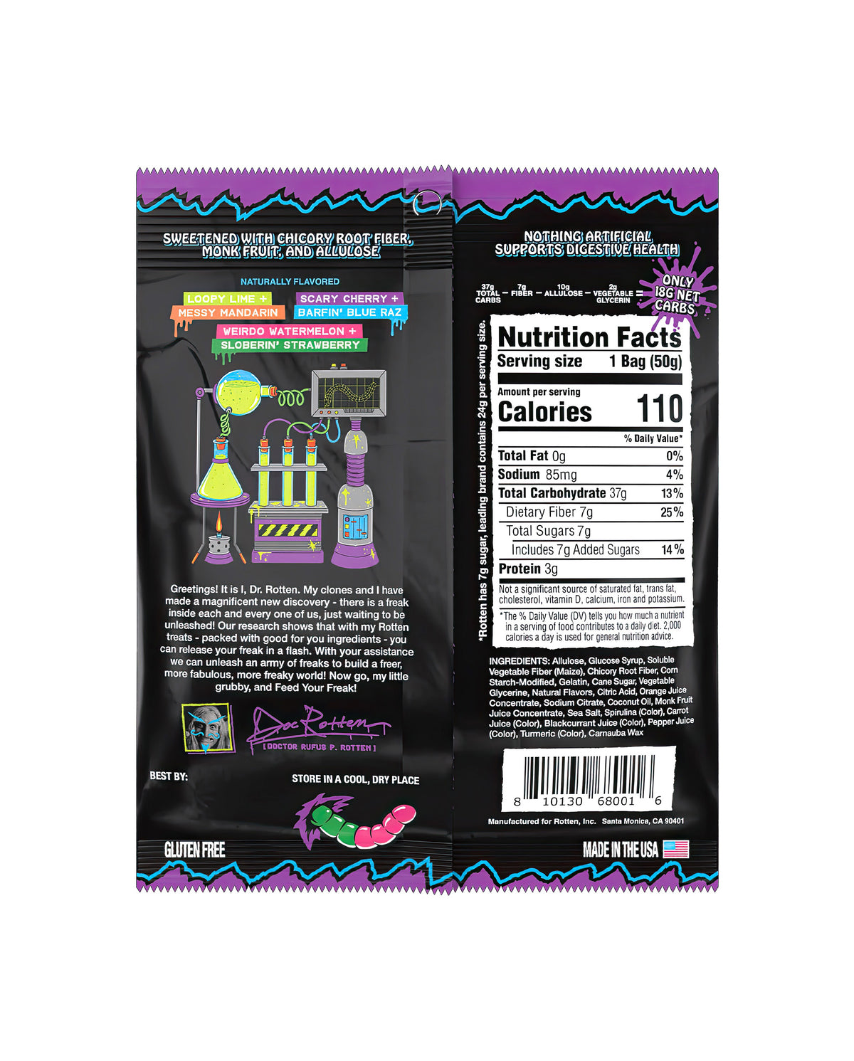 Unwrap more than just candy with Rotten® Original Gummy Worms! Each bag of these fruity gummies is packed with 7 grams of prebiotic fiber, less sugar than traditional sweets, and colors derived from all-natural fruits, vegetables and superfoods for a healthy, gut-friendly and delicious alternative. These gummies are the perfect afternoon pick-me-up, office desk treat, or gift for a health-conscious candy lover!