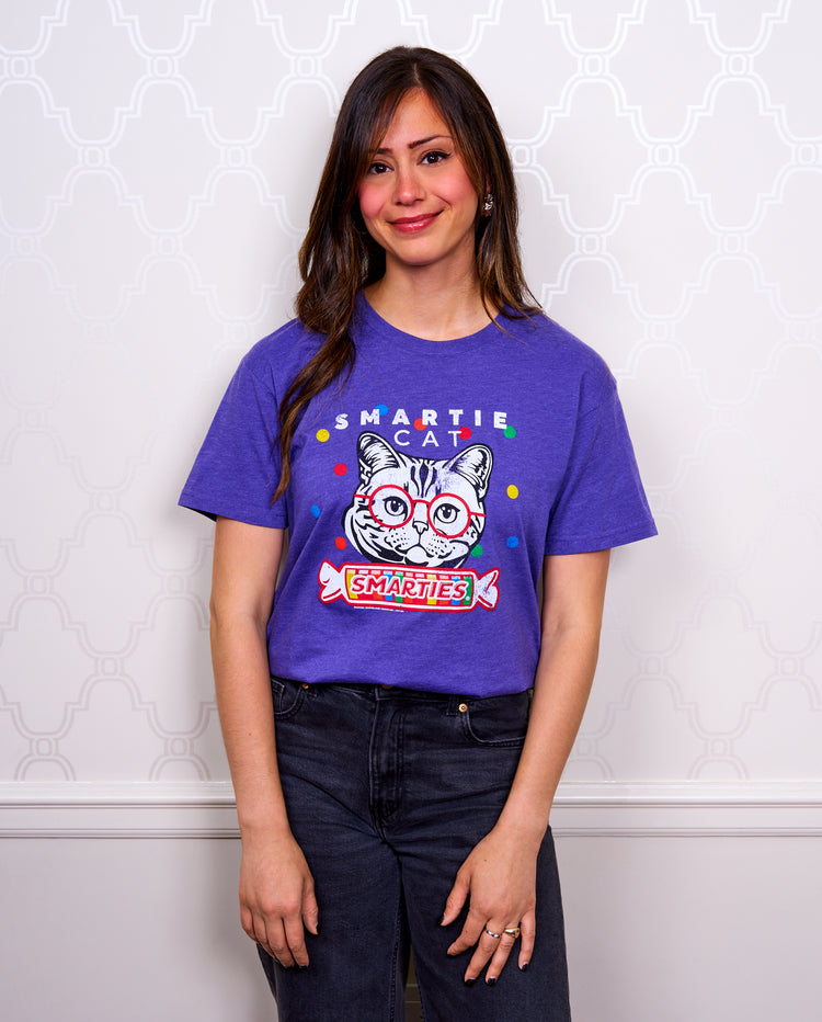 Add some sweetness to your wardrobe with this retro Smarties® Smartie Cat T-Shirt! With a shirt color exclusive to Dylan’s Candy Bar, this tee features the iconic Smarties® candy roll and an adorable cat. This timeless classic is perfect for nostalgia lovers, pun connoisseurs and anyone who appreciates old-school charm.