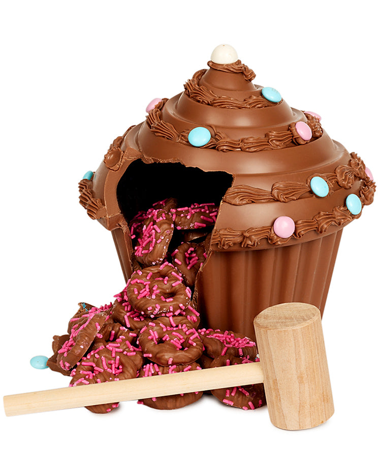 Our Gender Reveal BashCake® is a delicious, interactive way to share your sweet news. Use the included Dylan’s Candy Bar® wooden mallet to break the giant cupcake’s milk chocolate shell and watch pink-sprinkled milk chocolate-covered pretzels spill out!