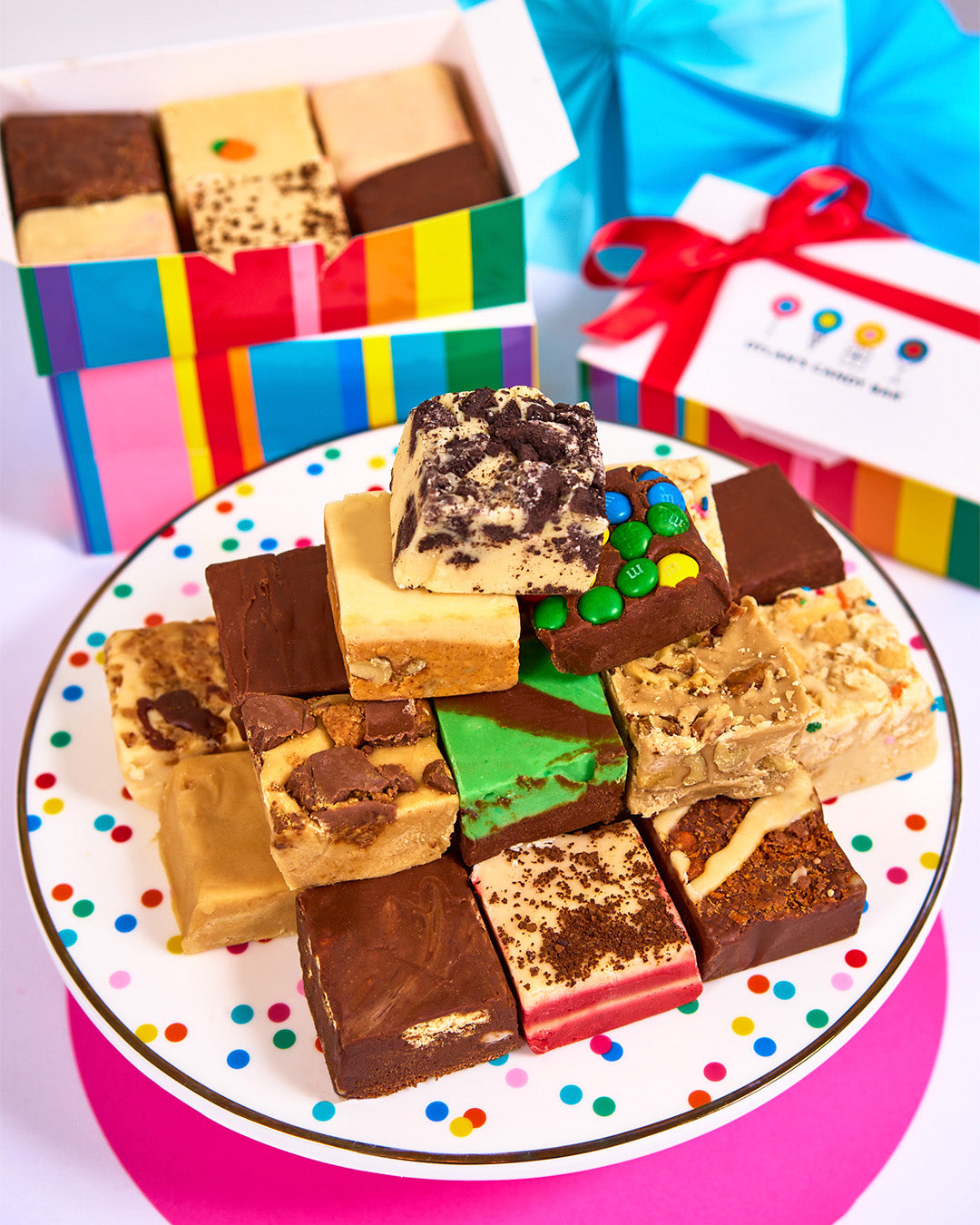 Perfect for sharing, our fudge sampler boxes feature enough flavors to satisfy any sweet tooth. Our Candy Bar Fudge Sampler Box includes six pieces of fudge in the quintessential flavors of M&M’s®, Heath® Bar, Butterfinger®, cookies & cream and Twix®.